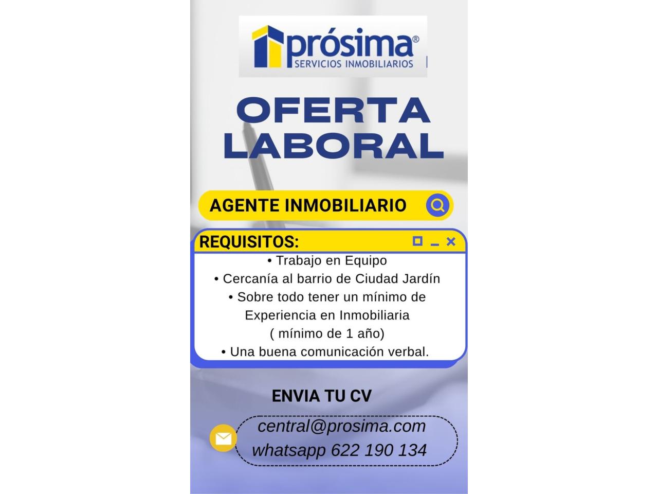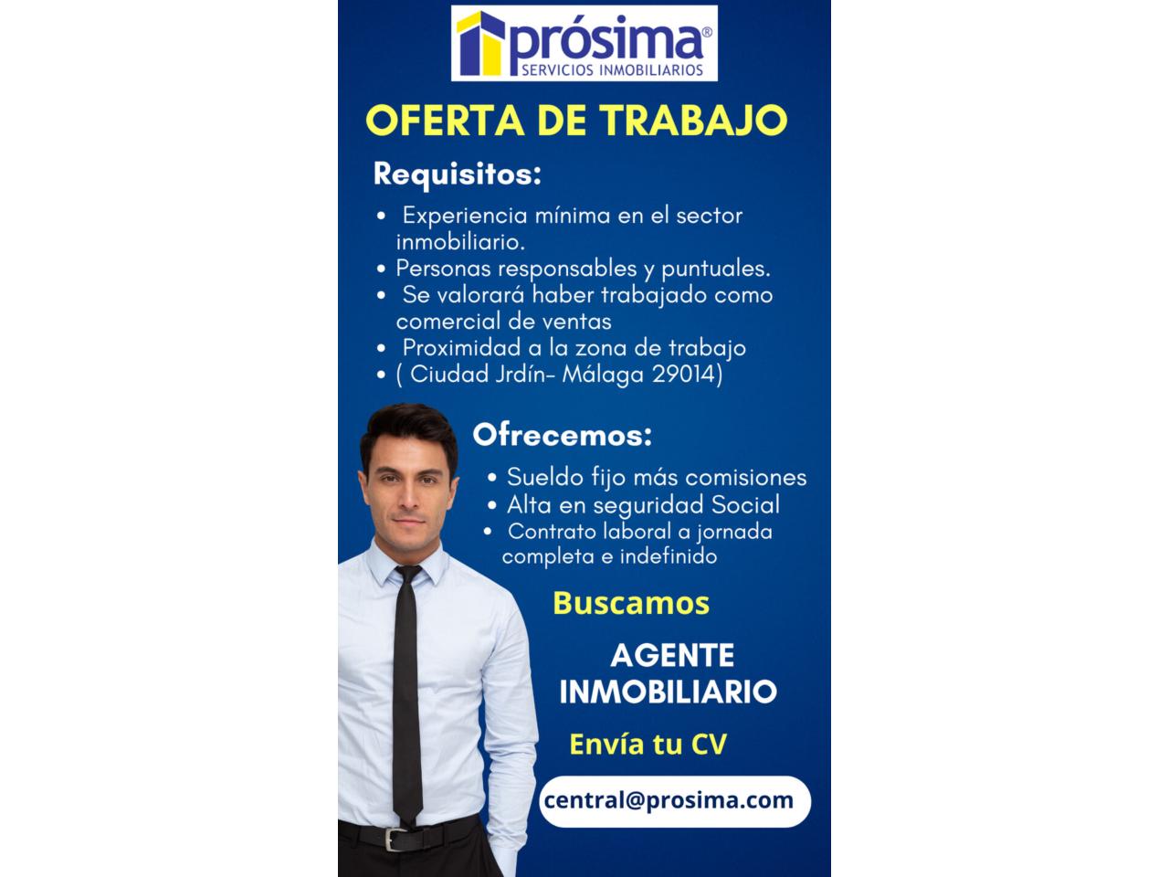 DescripciónInmobiliaria Prósima con más de 25 años de experiencia en el sector inmobiliario busca asesores/as para incorporación inmediata por ampliación de plantilla para su oficina de Ciudad Jardín en C/ Emilio Thuiller Nº 30, Málaga 29014 Se ofrece: • Alta en seguridad social a Jornada completa • Sueldo fijo + Comisiones e Incentivos • Formación media a cargo de la empresa • Jornada laboral de 5 días / Horario mañanas y tardes